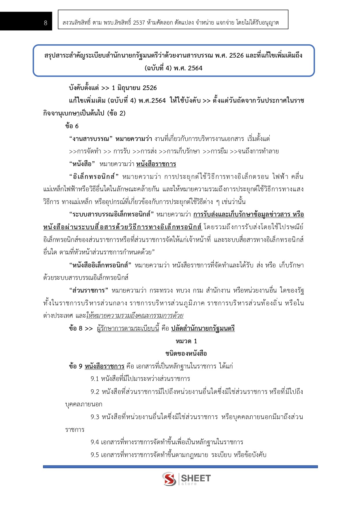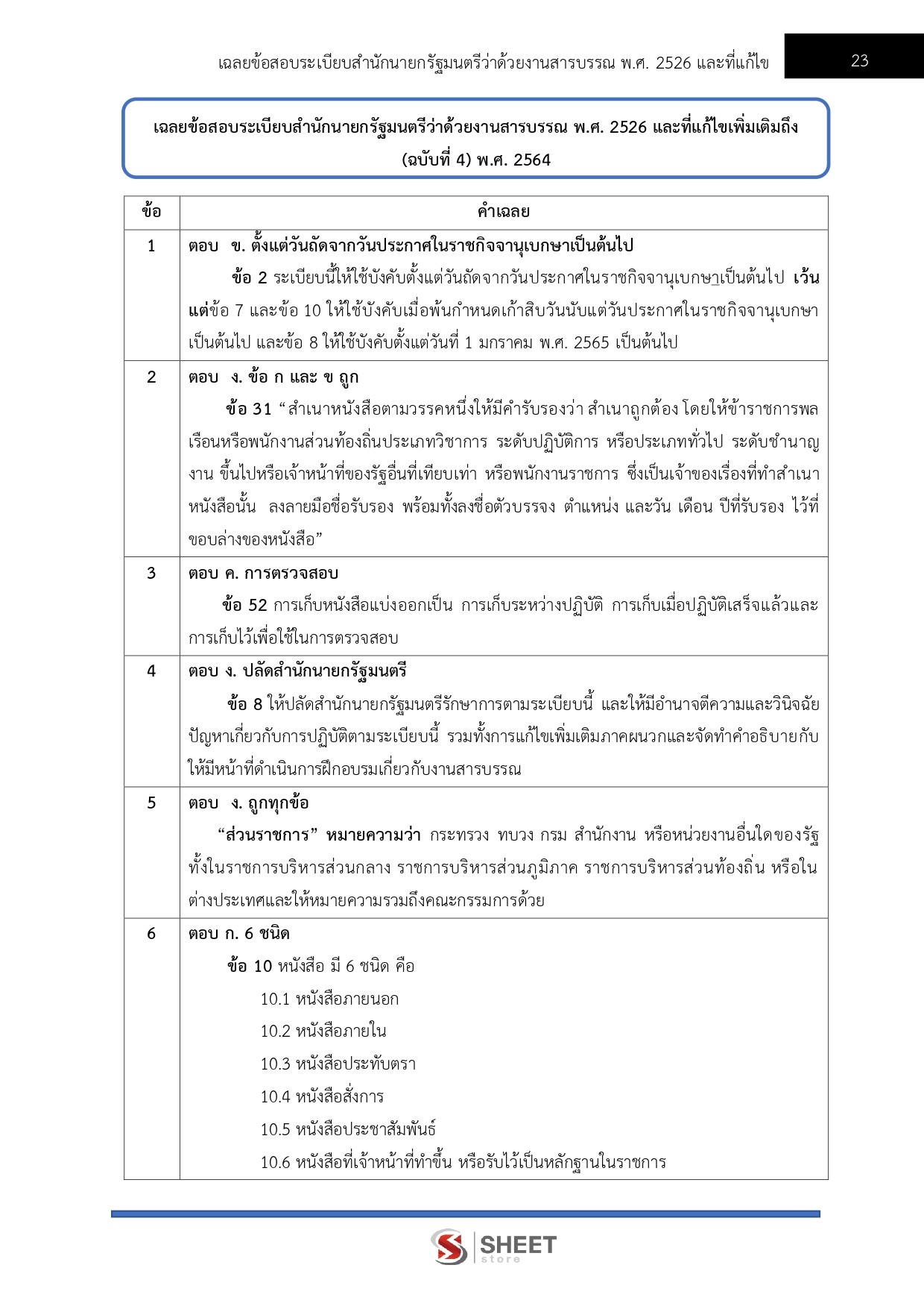 – แนวข้อสอบสรุปสาระสำคัญระเบียบสำนักนายกรัฐมนตรีว่าด้วยงานสารบรรณ พ.ศ. 2526 และที่แก้ไขเพิ่มเติมถึง (ฉบับที่ 4) พ.ศ. 2564