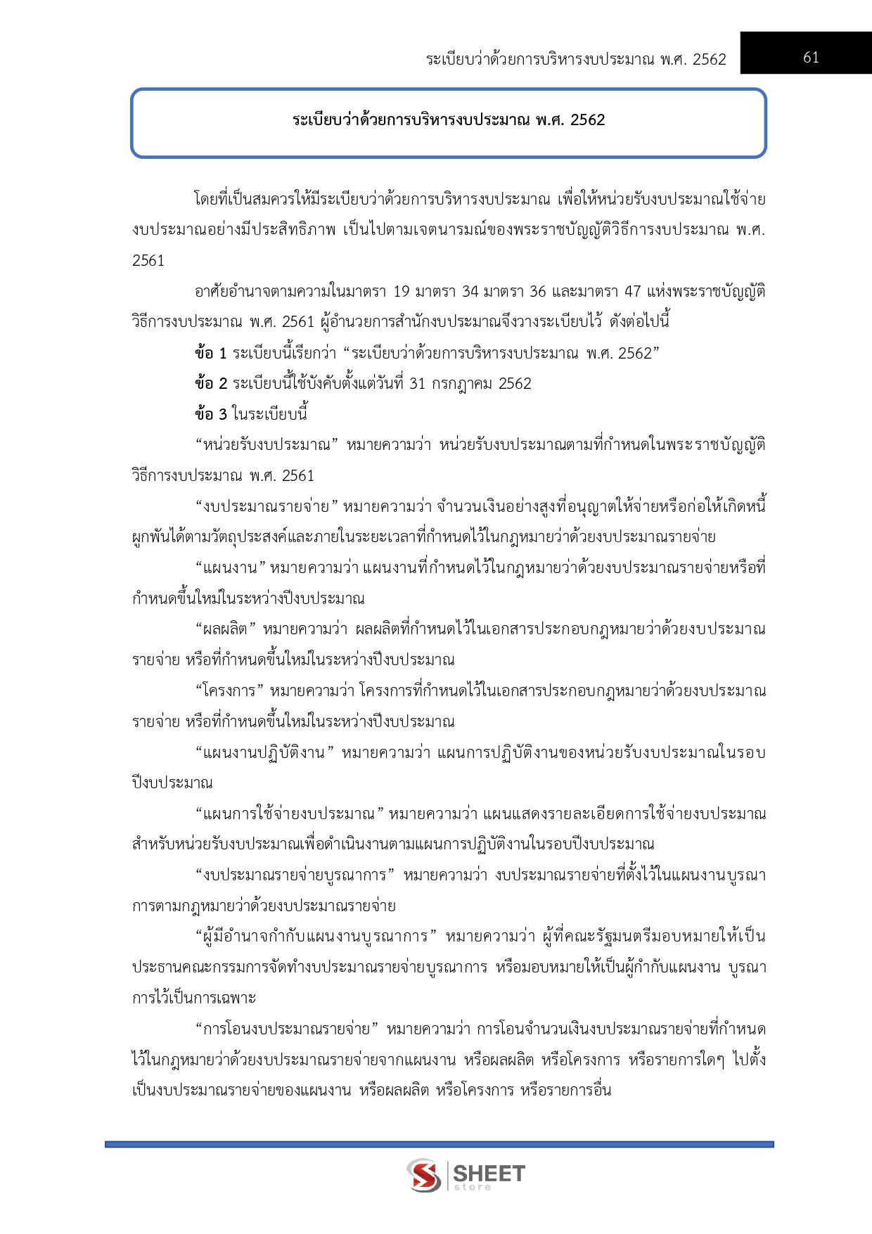 – ระเบียบว่าด้วยการบริหารงบประมาณ พ.ศ. 2562