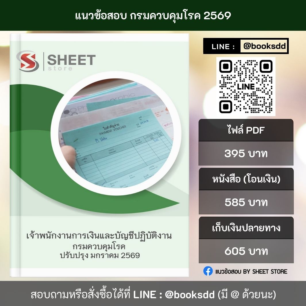 แนวข้อสอบ เจ้าพนักงานการเงินและบัญชีปฏิบัติงาน กรมควบคุมโรค 2569 เนื้อหาครบถ้วน ครอบคลุมทุกหัวข้อที่ต้องรู้ ครบตามประกาศรับสมัคร 📝 แนวข้อสอบ พร้อมเฉลยละเอียด ที่จะช่วยให้คุณสอบผ่านได้อย่างมั่นใจ จัดทำโดยทีมงานมืออาชีพเฉพาะตำแหน่ง สามารถสั่งซื้อ แนวข้อสอบ เจ้าพนักงานการเงินและบัญชี กรมควบคุมโรค 69 ได้ที่ LINE ID : @booksdd