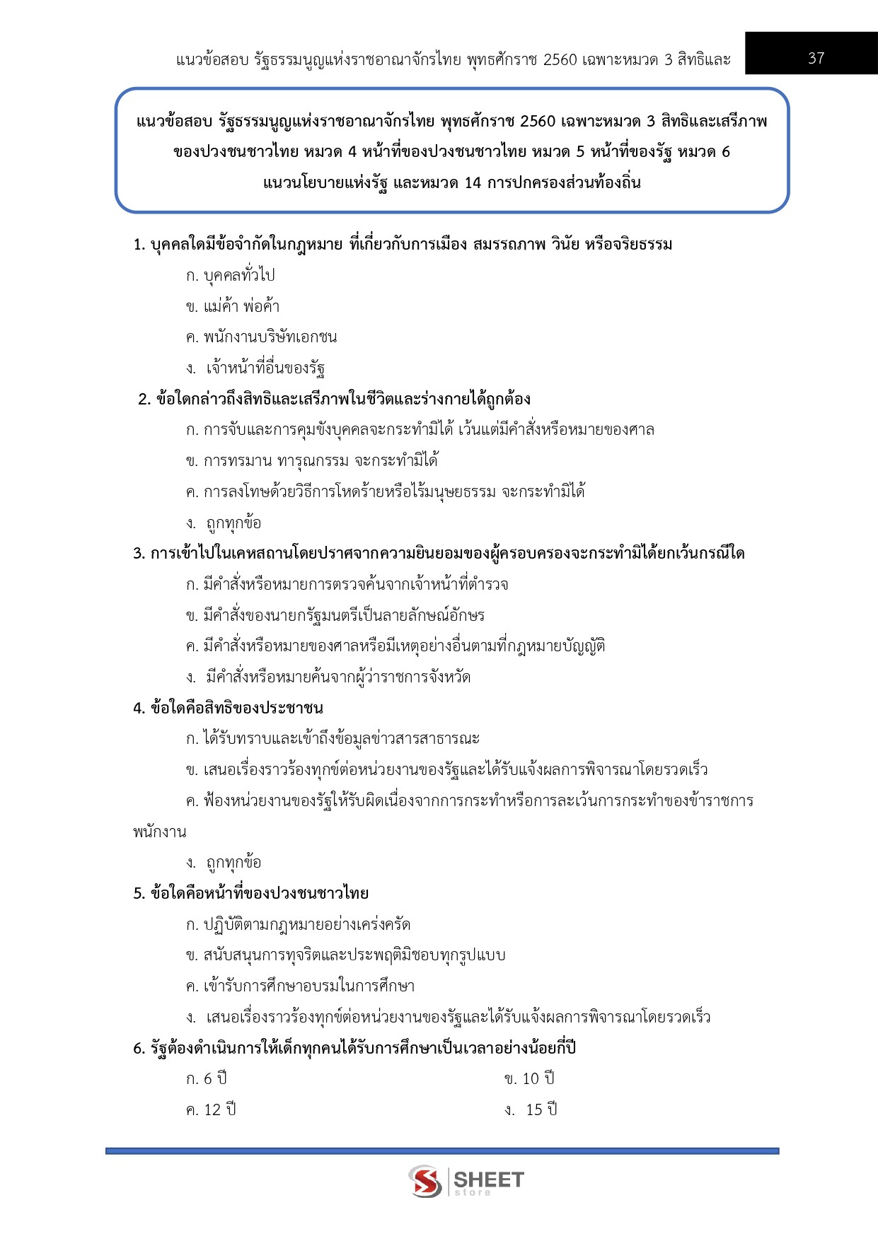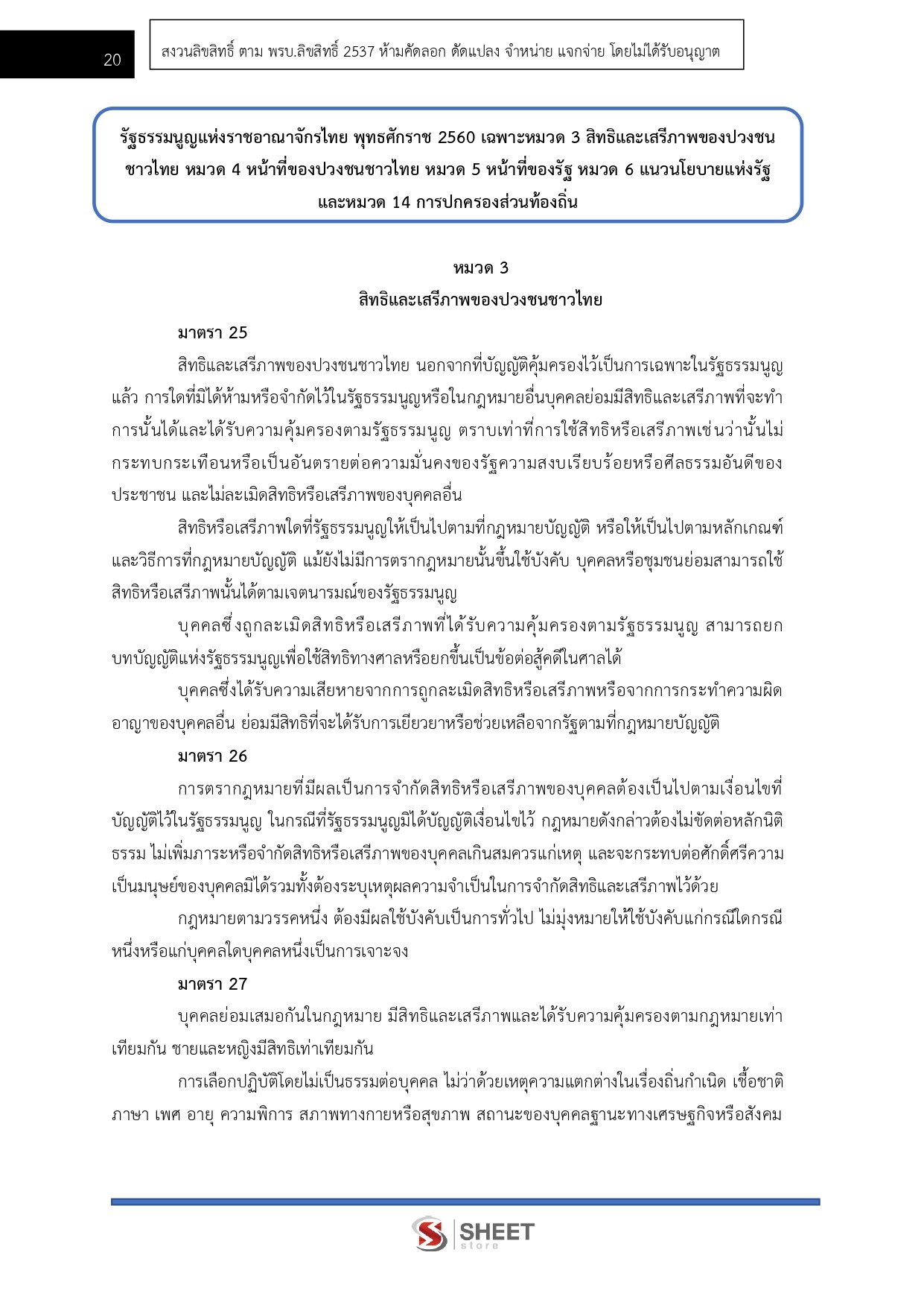 – แนวข้อสอบรัฐธรรมนูญแห่งราชอาณาจักรไทย พุทธศักราช 2560 เฉพาะหมวด 3 สิทธิและเสรีภาพของปวงชนชาวไทย หมวด 4 หน้าที่ของปวงชนชาวไทย หมวด 5 หน้าที่ของรัฐ หมวด 6 แนวนโยบายแห่งรัฐ และหมวด 14 การปกครองส่วนท้องถิ่น